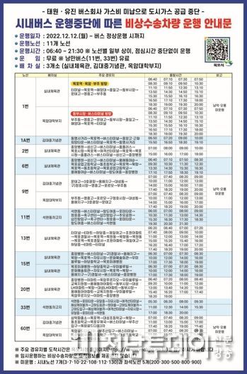 전세버스 비상수송차량의 운행시간은 배차간격을 조정해 아침 7시부터 오후 2시까지이며, 낭만버스는 평일 운행시간과 동일하게 저녁까지 운행하는데 자세한 사항은 시 홈페이지를 참고하면 된다.