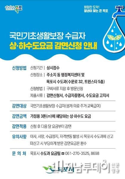 이번 감면은 26일부터 연중 상시 신청이 가능한데 신분증, 감면신청서, 수급자증명서, 수도요금 고지서를 지참해 주소지 동행정복지센터 또는 목포시 수도과(수문로 32, 트윈스타 5층)를 방문해 신청하면 된다.