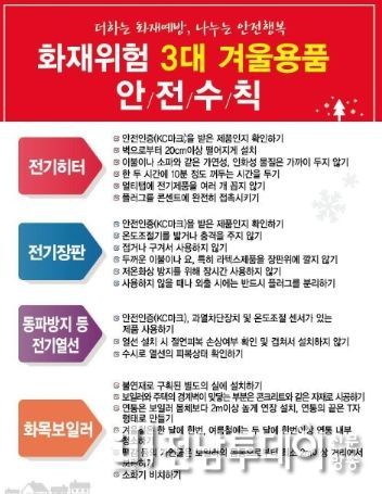 또한 ▲ 전열기구 사용 전 플러그 손상·전선피복 벗겨짐 확인 ▲ 외출 시 전열기구 플러그 뽑기 ▲ 전기용품 주변 가연물 제거 및 소화기 비치 등의 안전수칙을 준수해야한다.