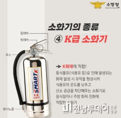 한편 박의승 서장은 “화재의 특성에 맞는 소화방법과 소화기구가 필요하다”며 "소화기 하나로 재산과 우리의 소중한 생명을 지킬 수 있는 만큼 안전의식을 가지고 주방용 K급 소화기를 비치해 주시길 바란다”고 밝혔다.
