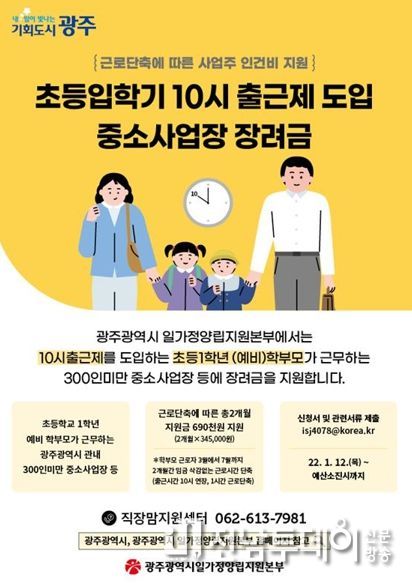 전남투데이 안철우 기자 | 광주광역시일가정양립지원본부는 올해 ‘초등입학기 10시 출근제 도입 중소사업장 장려금’ 지원기업을 모집한다.