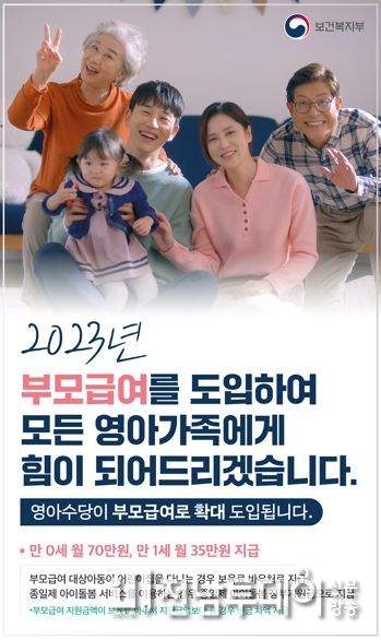 2022년도에는 만 0세(0~11개월)에게 월 30만 원의 영아수당이 지급됐으나 2023년부터는 부모급여로 변경돼 만 0세(0~11개월) 부모는 월 70만원, 만 1세(12~23개월) 부모는 월 35만 원을 각각 지급받게 된다.