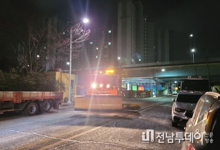 목포시는 본격적으로 눈이 내리기 전인 24일 새벽 03시부터 가용한 제설차량을 모두 동원해 제설제 사전살포를 시작으로 발 빠른 제설작업에 돌입했고, 많은 눈과 함께 한파와 강풍까지 예보되고 있어 주요 경사로 등 결빙 우려 지역이 발생할 것으로 보고 긴장을 늦추지 않고 있다.