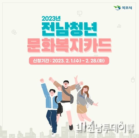 전남투데이 김호정 기자 | 목포시가 오는 2월 1일부터 28일까지 청년들을 대상으로 전남청년 문화복지카드 지원대상자를 모집한다.