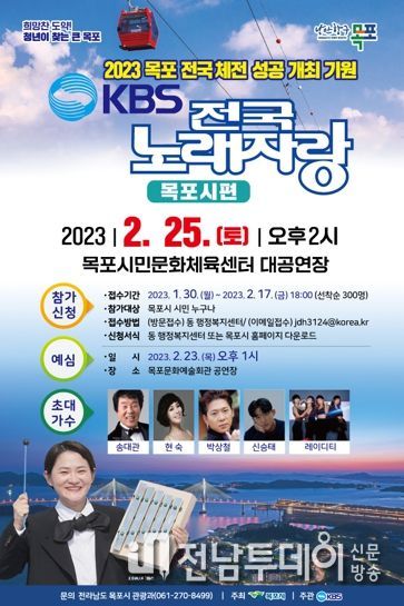 목포시는 오는 10월과 11월의 제104회 전국체육대회와 제43회 전국장애인체육대회의 성공을 기원하는 KBS 전국노래자랑’목포시편 공개 녹화가 오는 25일 오후 2시 목포시민문화체육센터 대공연장에서 열린다고 밝혔다.