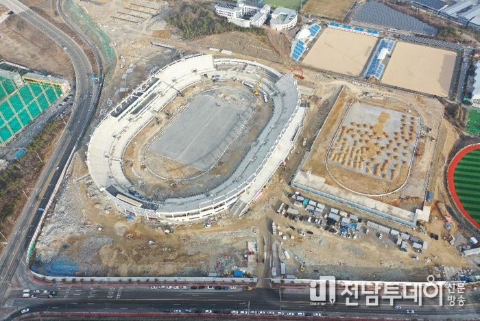 목포종합경기장은 현 공정률 81%로 전국체전 개·폐회식과 육상 경기가 열릴 예정으로 총 공사비 1,148억원(국비 200, 도비 330, 시비 618)을 투입해 지상 3층, 연면적 26,468㎡, 관람석 16,468석 규모로 올해 6월까지 주요공사가 마무리된다.