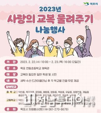 전남투데이 김호정 기자 | 목포시가 오는 22일부터 23일까지 연동초등학교 체육관에서 34개 중·고등학교가 참여한 ‘2023 사랑의 교복 물려주기’ 행사를 실시한다.