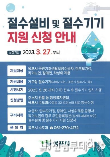 전남투데이 김호정 기자 | 목포시는 국민기초생활보장 수급자, 한부모가정, 독거노인, 장애인, 차상위계층 가구를 대상으로 절수설비 및 절수기기(샤워기 헤드, 대변기 절수기 등)를 지원한다.