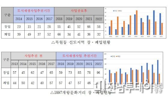 다음으로 1897개항문화거리 지역은 사업추진 이전에는 평균 창업/폐업 건수는 55건/46건이었으나 사업기간(2018~2022)동안 평균 창업/폐업 건수는 78건/49건으로 사업 이전보다 창업건수가 증가하고 있는 것으로 분석됐다.