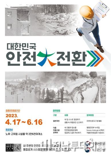 ‘대한민국 안전大전환 집중 안전점검’은 재난이나 사고 발생이 우려되는 시설 등에 대해 집중적으로 안전점검을 실시해 위험요인을 사전에 발굴하고 해소하며, 국민의 안전의식을 높이기 위한 사회적 안전운동이다.