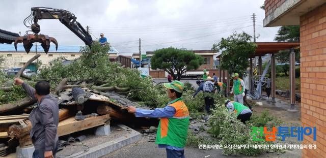 [전남투데이 김연자 기자] 영암군, 금정면자율방재단 (단장 정동원)은 제19호태풍 “솔릭”으로 월평리 식산마을 회관주 변 50년생 느티나무가 도괴(전복)되면서 마을정자1동이 전파되고 마을회관 지붕 일부도 파손되는등 회관지붕에 도괴된 나무가 걸쳐 있어 추가 피해가 발생될 수 있다는 신고를 접하고 방재단 긴급 소집동원령을 내려 오전 9시부터 도괴된 노거수 제거작업에 구슬땀을 흘렸으며 관내 도로주변등에 도괴된 노거수 6주에 대해서도 신속하게 대응하여 차량통행을 원활하게 유도하여 자연재해로부터 면민의 재산과 안전을 지키는데 최선을 다하고 있다.