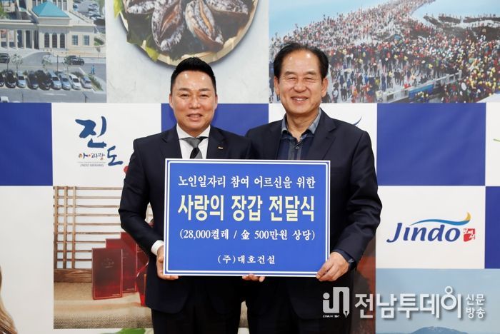 진도군의 향토기업인 DH그룹의 김남중 회장과 직원들이 진도군청을 방문, 노인일자리와 사회활동지원 참여 어르신들을 위해 500만원 상당의 작업용 장갑을 전달했다.
