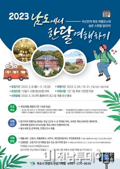 전남투데이 김호정 기자 | 목포시가 장기여행하며 목포의 아름다움을 체험하고, 자신만의 여행코스와 숨은 관광자원을 홍보할 ‘한 달 여행하기’ 참가자를 오는 19일까지 모집한다.