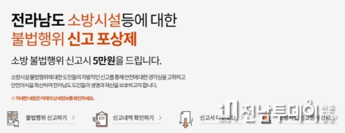 목포소방서는 안전무시 관행 근절을 위해 연중 업무로 신고포상제도를 운영 중에 있으며, 목포소방서 홈페이지 민원마당에서도 해당 내용을 확인 후 신고할 수 있다.