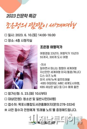 전남투데이 김호정 기자 | 목포시립도서관은 2023 인문학 특강 '조은정의 짬짬이 세계여행'을 오는 6월 10일 운영한다.