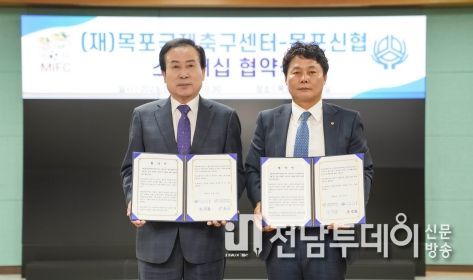 전남투데이 김호정 기자 | 재단법인 목포국제축구센터와 목포신협은 지역사회 발전과 스포츠 활성화를 위해 22일 목포시청 상황실에서 스폰서십을 맺었다.