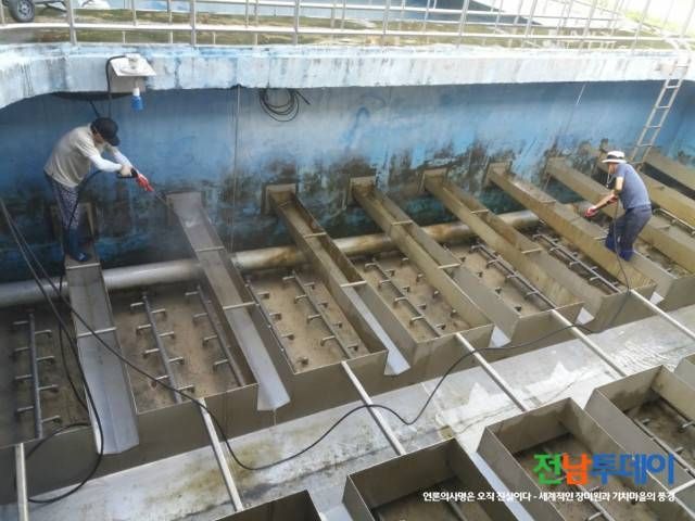 이에 안정적인 수도시설 운영을 위하여 직원들이 직접 정수장 여과지 삭취작업, 트럼프청소, 침전지 청소 및 정수장 제초작업을 실시하고 있으며,
