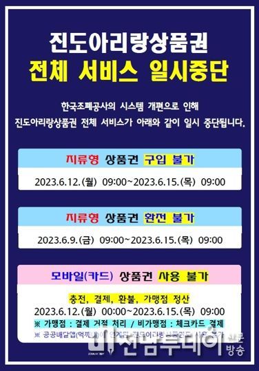 전남투데이 김완규 기자 | 진도군이 발행한 진도아리랑상품권이 오는 12일 0시부터 15일 오전 9시까지 사용이 일시 중단된다.