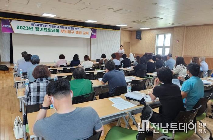 예방교육은 최근 진도여성플라자 어울마당에서 국민건강보험공단 해남진도지사 진도운영센터가 관내 노인복지시설‧장기요양기관의 시설장과 장기요양보험 청구담당자 등 약 40여 명을 대상으로 진행했다.