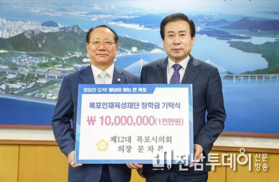 전남투데이 김호정 기자 | 문차복 목포시의회 의장이 30일 목포인재육성재단에 장학기금 1천만 원을 기탁했다.