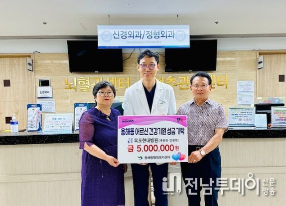 전남투데이 김호정 기자 | 목포현대병원이 용해동 어르신 건강 기원 행사에 사용해 달라며 목포복지재단을 통해 성금 500만 원을 지정 기탁했다.