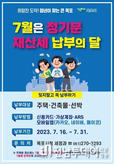시 관계자는 재산세는 우리 시민들의 복지 증진을 위해 사용되는 자주재원이므로 7월 31일까지 납부기간 내 납부해 줄 것을 당부했다.