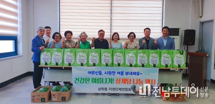 이번 행사는 무더운 여름철 어르신들의 건강한 여름나기를 기원하기 위해 삼학동 4개 자생조직(주민자치위원회, 통장협의회, 새마을부녀회, 새마을협의회)과 지역사회보장협의체가 힘을 모아 진행됐다.