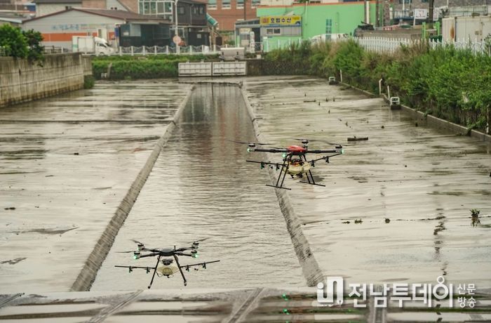 시는 지난 12일 시작한 드론 방역은 오는 8월말까지 남해빗물펌프장 인근에 위치한 남해유수지와 입암천 일대에서 진행된다고 밝혔다.