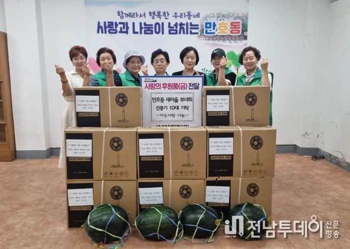 전남투데이 김호정 기자 | 만호동 새마을부녀회가 초복인 지난 11일, 올 여름 무더위를 타파할 선풍기 10대와 수박 4통을 만호동 행정복지센터에 기탁하고, 이를 경로당 2개소와 에너지 취약계층 8세대에 전달했다.