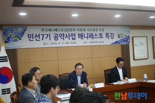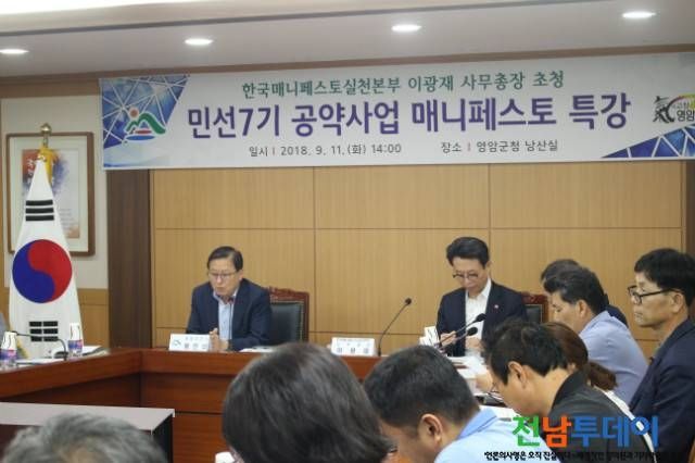 [전남투데이 김연자 기자] 영암군(군수 전동평)은 지난 11일, 한국매니페스토실천본부 이광재 사무총장을 초청하여 민선7기 공약사업 매니페스토 특강을 실시하였다.