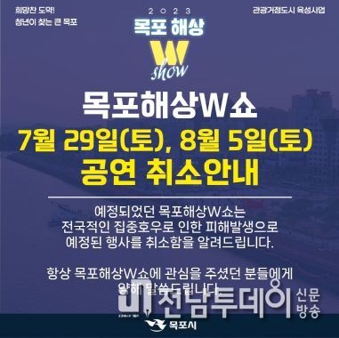 전남투데이 김호정 기자 | 목포시는 목포해상W쇼 개최 예정이었던 7월 29일 정기공연과 8월 5일 특별공연을 취소한다고 밝혔다.