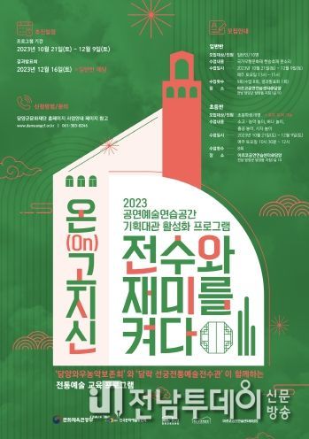 전남투데이 탁상훈 기자 | (재)담양군문화재단은 오는 10월 13일까지 2023 공연예술연습공간 기획대관 프로그램 '온(On)고지신 : 전수와 재미를 켜다' 참여자 모집을 진행한다고 밝혔다.