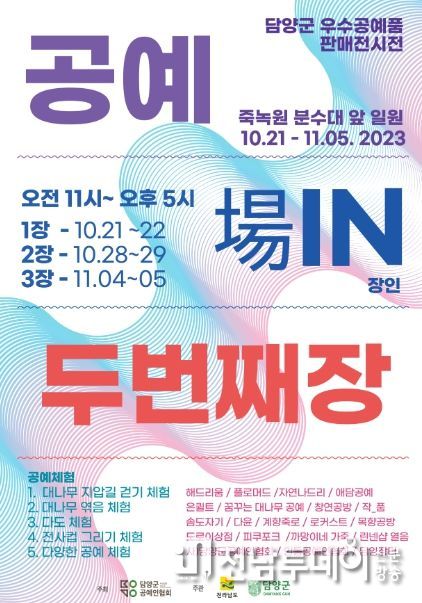 전남투데이 탁상훈 기자 | 담양군과 (사)담양군공예인협회가 오는 21일부터 11월 5일까지 매주 토요일과 일요일 죽녹원 분수대 광장에서 공예품 전시 판매행사 ‘공예 장인(場IN) 두 번째 장’을 개최한다.