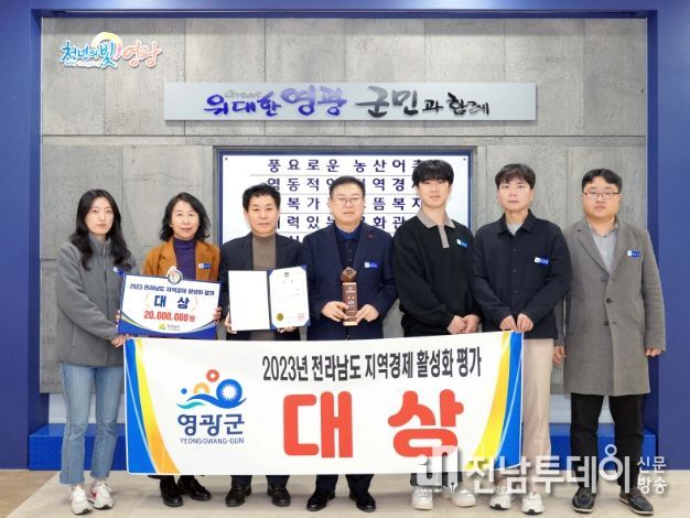 전남투데이 박세훈 기자 | 영광군은 지난 22일 전남도청 왕인실에서 열린 2023년 일자리경제 한마당 행사 시상식에서 “2023 지역경제 활성화분야 평가” 관련 대상을 수상하며, 기관 표창과 2천만 원의 시상금을 받았다.