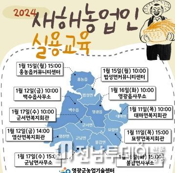 전남투데이 박세훈 기자 | 영광군은 오는 1월 11일부터 대마면을 시작으로 1월 17일까지 각 읍·면에서 농업인 1,000명을 대상으로 10회에 걸쳐 ‘2024년 새해 농업인 실용교육’을 실시한다고 밝혔다.