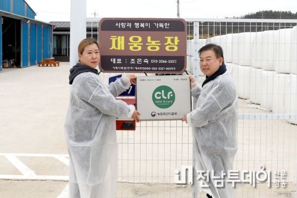 전남투데이 박세훈 기자 | 강종만 영광군수는 지난 9일 군서면 소재 채움농장(대표 조은숙)을 방문하여 깨끗한 축산농장 지정서와 농장 현판을 전달하고, 농장주를 격려했다.