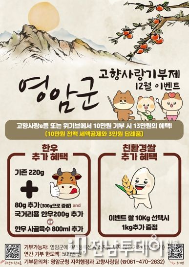 나아가 영암군은 답례품 업체들과 간담회를 열고, 협의를 거쳐 12월 기부제 연말 이벤트로 특산품 추가 증정을 실시했다.