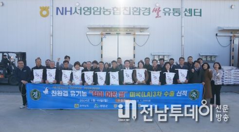 전남투데이 박상훈 기자 | 영암군이 15일 서영암농협친환경쌀유통센터에서 친환경 유기농으로 생산한 ‘학이머문쌀’ 10톤의 미국 수출 3차 선적식을 가졌다.