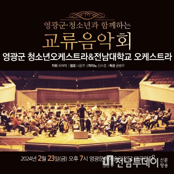 영광군은 오는 23일 오후 7시, 영광문화예술의전당 대공연장에서 영광군 청소년오케스트라와 전남대학교 오케스트라가 함께하는 교류음악회가 열린다고 밝혔다.