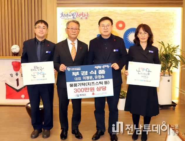전남투데이 박세훈 기자 | 지난 21일 ㈜부경식품은 영광군에 치즈스틱, 치즈핫도그 등 300만 원 상당의 자체 생산품을 관내 사회복지시설을 위해 기탁하여 온기나눔 캠페인에 동참했다.