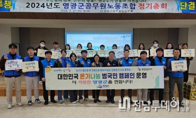 전남투데이 박세훈 기자 | 영광군공무원노동조합은 지난 27일 영광군청 3층 대회의실에서 300여 명의 조합원이 참석한 가운데 2024년도 정기총회를 열고 영광군에서 추진 중인 온기나눔 릴레이 캠페인에 동참했다.