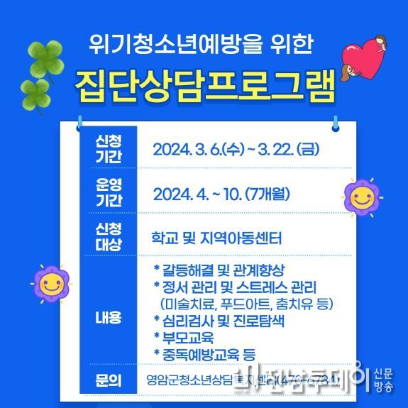 전남투데이 박상훈 기자 | 영암군청소년상담복지센터가 4~10월 위기 청소년 예방 집단상담프로그램을 운영한다.