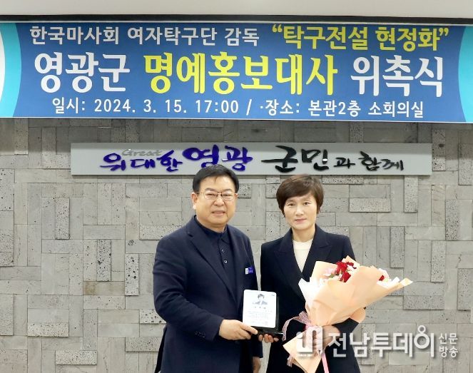 전남투데이 박세훈 기자 | 영광군은 지난 15일 영광군청 소회의실에서 명예홍보대사 위촉식을 갖고 한국마사회 여자탁구단 감독 현정화를 영광군 명예홍보대사로 위촉했다고 밝혔다.