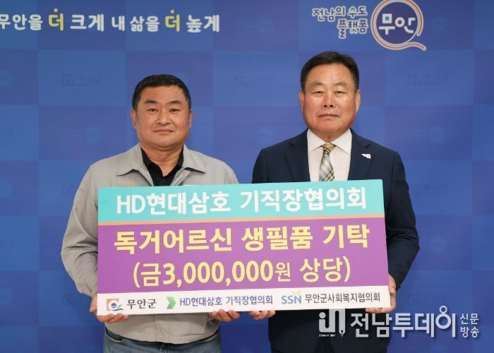 전남투데이 안철우 기자 | 전남 무안군은 지난 16일 HD현대삼호 기직장협의회가 독거어르신을 위하여 300만원 상당의 생필품을 기탁했다고 밝혔다.