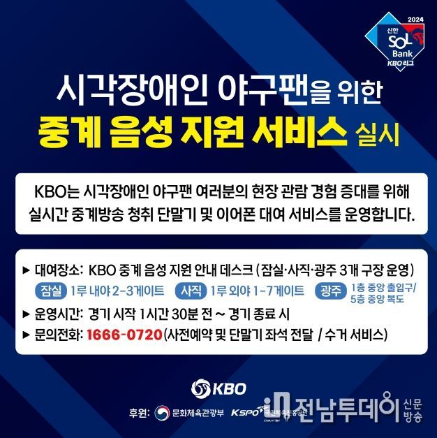전남투데이 박세훈 기자 | KBO는 지난해에 이어 오는 7월 12일(금)부터 잠실, 사직, 광주 3개 구장에서 KBO 리그 시각장애인 현장 관람객 대상 중계 음성 지원 서비스를 실시한다.