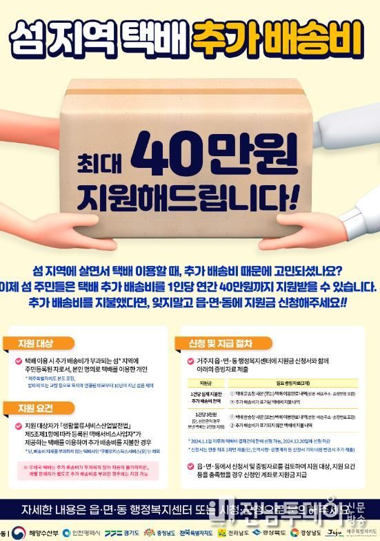 전남투데이 김완규 기자 | 전라남도는 육지보다 비싼 택배 요금이 부과되는 섬 주민의 경제적 부담을 줄이기 위해 한시 추진했던 섬 지역 택배 추가배송비 지원사업을 연중으로 확대하고, 전년보다 2배 많은 28억 원의 예산을 투입한다고 밝혔다.