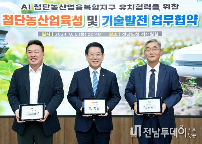 전남투데이 김완규 기자 | 전라남도는 6일 도청 서재필실에서 ㈜대동, (사)한국농업기계학회와 인공지능(AI) 첨단농산업융복합지구 유치를 위한 첨단농산업 육성·기술발전 업무협약을 했다.