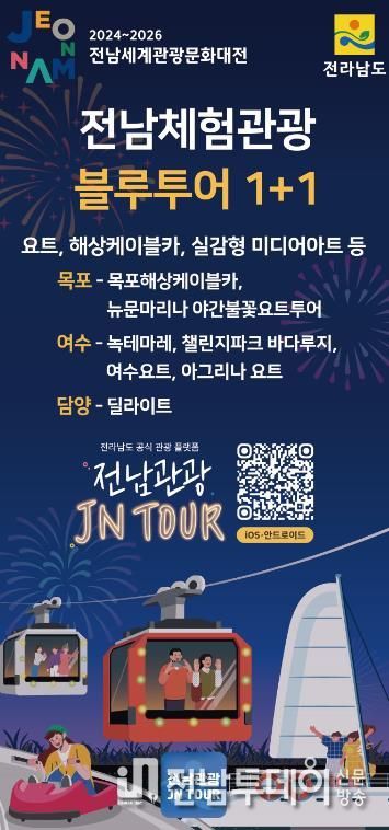 전남도는 ‘1+1 블루투어’ 상품 외에도 ‘남도 숙박할인 빅 이벤트’, ‘고향애(愛) 여행가자’ 상품을 출시해 관광산업 활성화에 기여하고 있으며, 자세한 사항은 전남관광플랫폼(JN TOUR) 앱을 통해 확인할 수 있다.