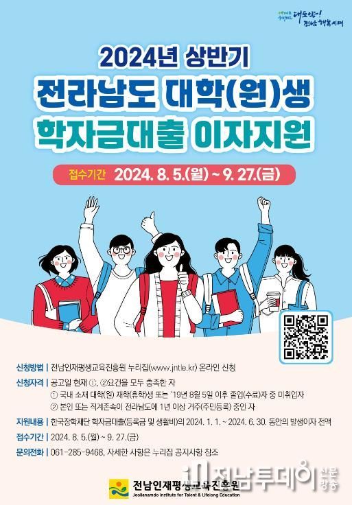 전남투데이 김완규 기자 | 전라남도는 대학(원)생 및 취업준비생의 경제적 부담을 덜어주고 안정적 학업 환경을 조성하기 위해 학자금 대출이자를 지원한다고 밝혔다.
