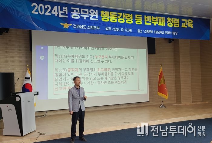 전남투데이 김완규 기자 | 전남소방본부는 17일 전남소방학교 인재관에서 2024년 소방공무원 승진자 및 신규임용 공직자 140여 명을 대상으로 공무원 행동강령 등 청렴 집합교육을 실시했다고 밝혔다.